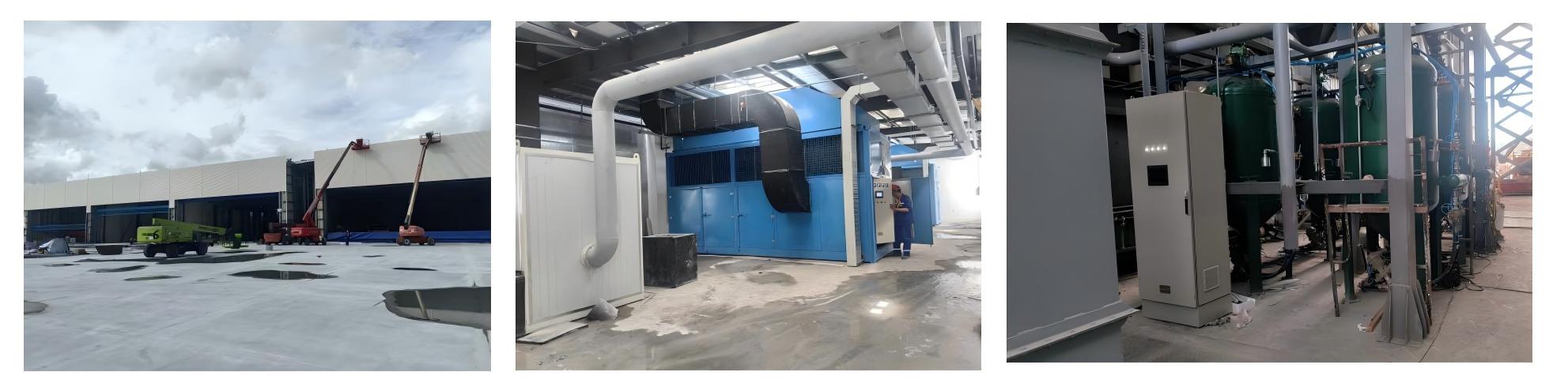 张忠民经理带领团队在艾郎临港现场顶着烈日连续作战,首先要将原来的设备进行拆除,由于老设备内有活性炭,对于动火作业点,必须再三确认并做好防护措施,防止火灾。好不容易设备拆除落地,又面临周转场地不足的难题,经反复协调才得以清运。而遗留的几十吨活性炭装袋与场地清扫,团队硬是咬牙用两天时间清理完毕。新设备进场后,甲方对登高、动火、吊装等作业监管极为严格,一次违章即被叫停并罚款,项目在整改、沟通与施工中艰难推进。面对10月15日滚涂房必须交付的节点,后续施工压力巨大。为此,我们要增加人员,国庆节加班,全力抢回进度。